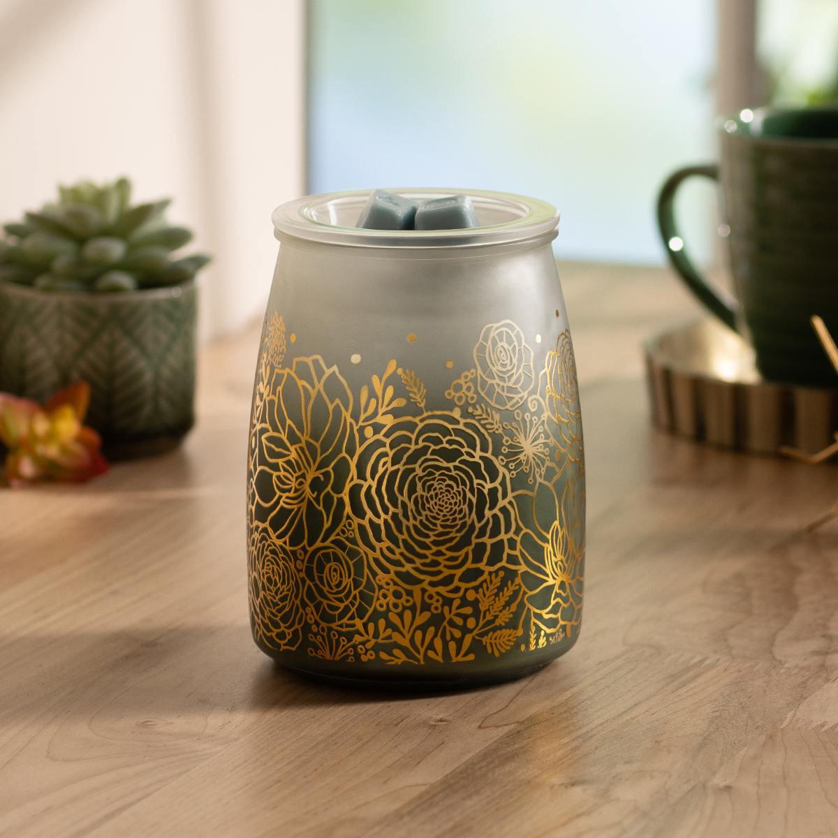 Scentsy’s current charitable cause product is the Tranquil Glow Warmer. Light shines through gold succulents in a soothing green ombre glow.
